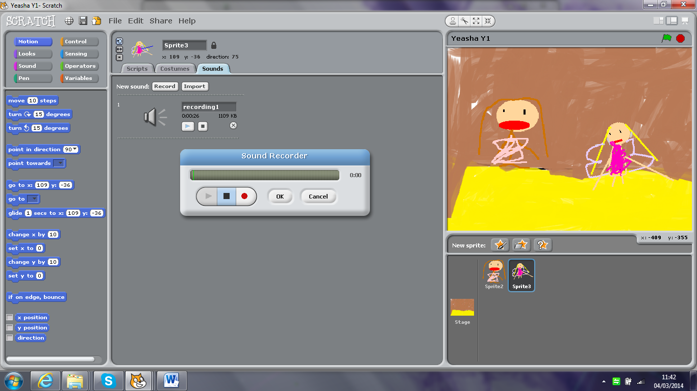 The first, on the left of the picture above, is for the pupils to make the actual recording, and the second, on the right, is to show them the running Scratch file, so that timings can be made accurate much more easily.