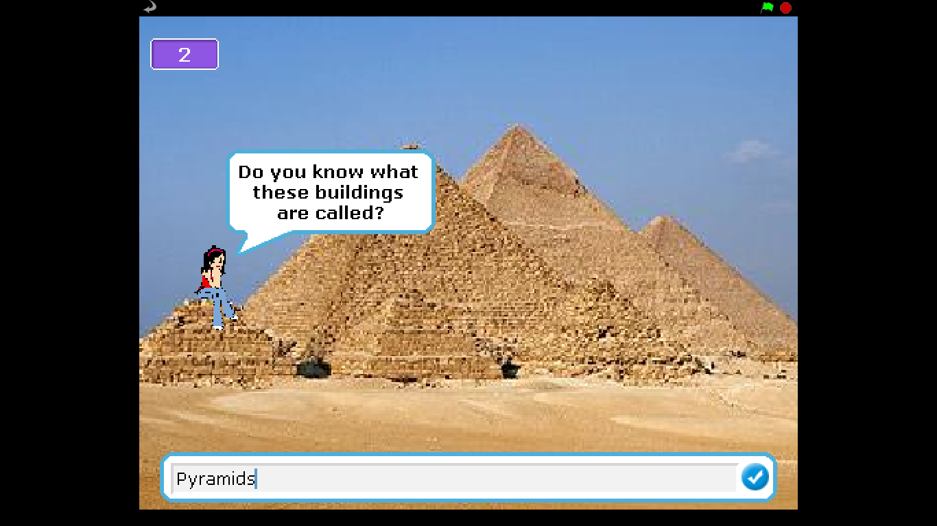 Through effective planning and preparation, Scratch can take students on a virtual tour of engaging and creative learning. A tour where they can visit historical or geological sites, study the world around us as it is today or in the past, explore the wonders of numeracy or the creativity that can be found within literacy. The list as to what can be achieved with Scratch is endless but creativity is an ingredient that must accompany it. Many of the projects that have been previously produced by individuals using Scratch are entertainment based rather than educational. It was therefore necessary to think about how the scripts and controls that are available to use could be adapted to achieve the intended purpose: cross-curricular learning. For example when asking questions, one must enter the many possible answers that a student might give in order for the project to continue. This was important as not all students will answer a question in the same way. Another example is if one wants a character to appear in a certain place, the X and Y coordinates must be used and adapted to achieve this. For reasons like these and others, I have come to believe that the programming side of Scratch would only be suitable to a class of upper key stage two students. It was intended that my project on Egypt would be sample as to what could be created by a Year Five or Six student with the intention of a younger student being capable of using it as revision or an introduction to Ancient Egypt and without the difficulty of creating it.